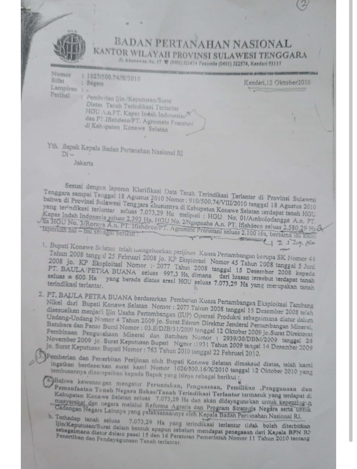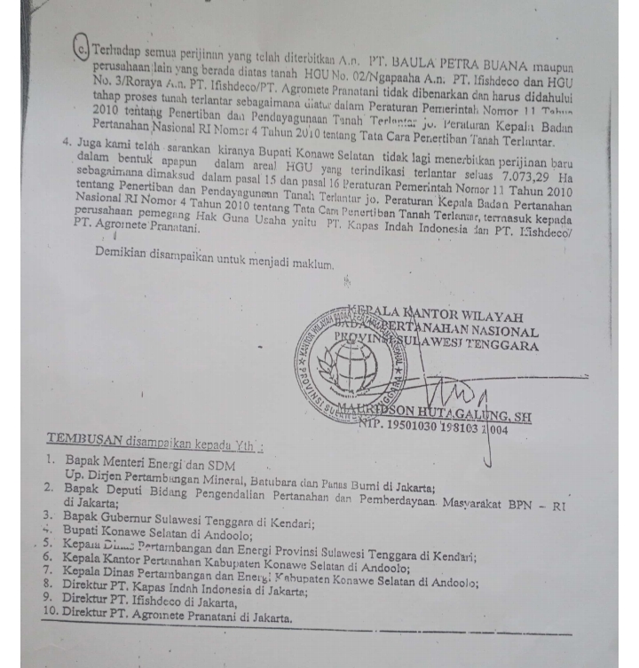 Sementara itu Kepala Bidang Penanganan Sengketa Badan Pertanahan Nasional Prov Sultra Andi. Memberikan gambaran umum berdasarkan data yang kami miliki yaitu pada tahun 1992 telah dikeluarkan HGU dengan SK kementerian agraria dan tata ruang dan di Perpanjang tahun 2017 berdasarkan SK kementerian agraria Namun kami tidak bisa memberikan keterangan lebih jauh karena ini merupakan kewenangan pusat namun kami akan segera berkonsultasi kepada pemerintah pusat untuk meminta berkas berkas yang ada Warkah2 yang ada dikantor kami suda bedah dan kami tidak bisa memberikan komentar banyak karena ini sudah merupakan kewenangan pusat kata Andi
