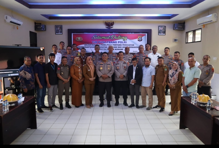 KONAWE||Pada hari Senin, 31 Juli 2023 pukul 14.30 WITA, Tim Pusat Penelitian dan Pengembangan (Puslitbang) Polri melaksanakan kegiatan penelitian tentang penguatan pemberantasan kejahatan jalanan dan aksi premanisme tahun 2023 di Polres Konawe. Kegiatan tersebut dihadiri oleh Kapolres Konawe AKBP Ahmad Setiadi, S.I.K., yang memberikan gambaran situasi wilayah hukum Polres Konawe.